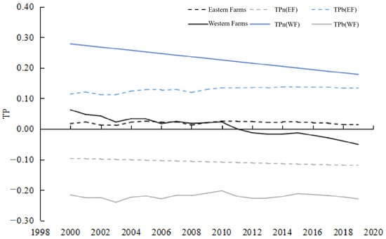 The changing trend of the TFPG of the two modes showed different characteristics. The TFPG in the Western Farms showed a steady declining trend with a rate of 7%/10a; the TFPG in the Eastern Farms showed a steady increasing trend, with a rate of 5.8%/10a (Figure 10).