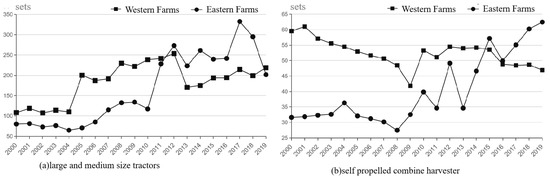 With the changing time, the TP of Eastern Farms increased slightly, while the Western Farms’s TP decreased at a rate of 0.5%. In the early 21st century, the TP of Western Farms was much higher than that in Eastern Farms. By early 2012, with the slowdown of the TPn, the TP in the Western Farms fluctuated negatively, showing a more obvious backward trend. In 2004, China fully liberalized the grain purchase and sales market, implemented the multi-channel management of purchases and sales, and established a direct subsidy system for farmers. The national agricultural policy stimulated investment in agricultural production, especially in state-owned farms. For example, in the early 21st century, the Hailar Farm Administration attached great importance to the investment in water conservancy facilities and large-scale modern agricultural machinery and equipment, forming a deep foundation of the agricultural technology. According to the survey data, the average number of large and medium-sized tractors and the self-propelled combine harvesters owned by the 11 farms in Western before 2010, was 1–3 times higher than that in the Eastern Farms (Figure 5). However, when the equipment and machinery became obsolete due to loss, the production capacity of the Western Farms gradually decreased, and there was a lack of strong and sustained technical support in the later period, which resulted in the weakening of the TP and a trend of a higher start and lower ending. Following the group reform in 2012, the Eastern Farms began to rapidly increase the input of the large and medium-sized tractors and combine harvesters, which greatly promoted the growth of the TP.