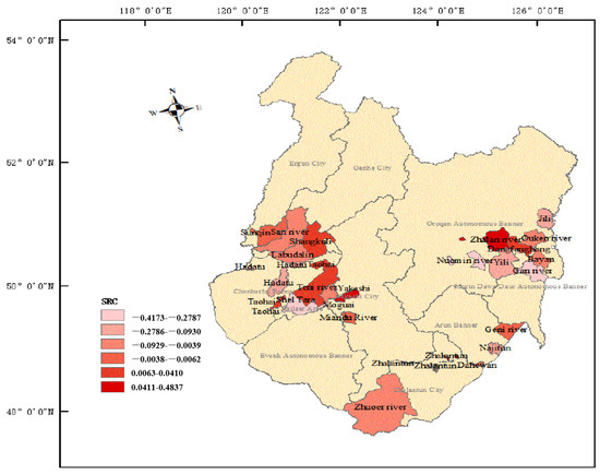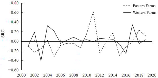 Modern agricultural production is equipped with a large number of large-scale mechanical equipment, irrigation systems, and other fixed essential production factors. As long as the farm does not reach the maximum capacity of the fixed factors, expanding the scale production will continue to bring the returns to scale, that is, they are economies of scale, but this state is only a short-term phenomenon. Without technological progress, the long-term state of the agricultural production will tend to decrease the returns to scale. The SRC in the Eastern and Western Farms are generally negative (Figure 6 and Figure 7), and the annual average SRC is also negative (Western Farms, −0.57% and Eastern Farms, −2.63%), which confirms the universality of the law of the diminishing marginal returns. In contrast, the decline rate of the SRC in Western Farms was relatively slow, and the average decline rate was 2.06% lower than that in the Eastern Farms. The fundamental reason for this is that the operators of the Western Farms have stronger advantages in choosing agricultural technology, in order to adapt to the agricultural-scale production.