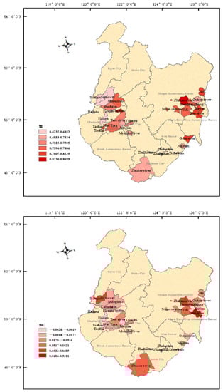 Under the two modes, the technological efficiency progress showed a steady fluctuation, as a whole, with the average annual rate of the TEC in the Western Farms (2.39%), slightly lower than that in the Eastern Farms (8.28%). The fluctuation range was relatively larger in 2000–2005 and 2015–2019, as shown in Figure 9. On the one hand, affected by natural disasters, the loss of the technological efficiency is serious, resulting in negative fluctuations in the technological efficiency progress rate, and the impact of the natural disasters on the technological efficiency loss was more obvious in Western Farms. On the other hand, after the natural disasters, the farm capital, factors, and other inputs increased to restore production, and the corresponding technological efficiency progress rate also increased significantly. In the Western Farms, the technological efficiency changes of the Suqin, Sanhe, Labdalin, and Hadatu farms, were particularly prominent. The survey found from 2000 to 2003, the four farms took the lead in purchasing large and medium-sized advanced agricultural machinery, such as large and medium-sized tractors, seeders, and combine harvesters, and the average number of purchases was more than the other farms, which increased the technological efficiency of the four farms, in 2004, by more than double, compared with the previous year.
