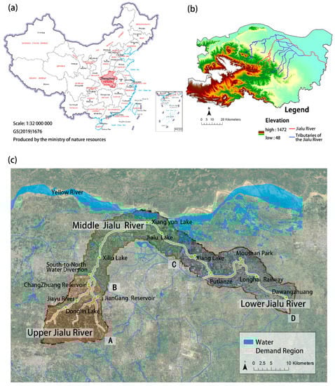 (a) Location of Zhengzhou, Henan Province, in China; gray lines indicated the boundaries of provinces and territories. (b) Location of Greater Zhengzhou with elevations; red lines indicate the Jialu River, and blue lines indicate the tributaries of the Jialu River. (c) Satellite image of Jialu river system; the area within the red polygon is the demand region, point A indicates the origin of the Jialu river watershed, point B indicates the South-to-North Water Diversion Project points, point C indicates eastern boundary of built-up area of Zhengzhou, and point D indicates the eastern boundary of Greater Zhengzhou.