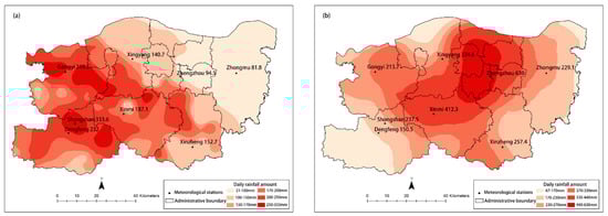 The rainfall patterns from July 19 to 21 2021: (a) rainfall amounts from 0600 UTC 19 to 0600 UTC 20 July 2021; and (b) rainfall amounts from 0600 UTC 20 to 0600 UTC 21 July 2021.