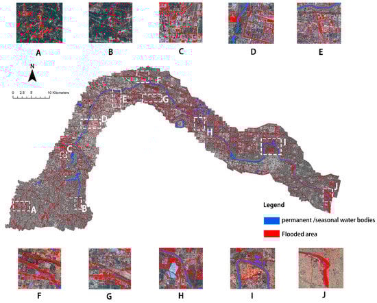 Maps of the extent of flood inundation at 10:31 pm on 20 July 2021 in the Jialu River System in greater Zhengzhou, China. The higher flood inundation intensity is shown for ten subsets (A–J) across the study areas.