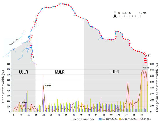 Changes in the open water stretch within the main channel of Jialu River before and after the flooding event are used to show the relative flooding severity along the three regions of Jialu River (Figure 5). In UJLR, the width differences of the open water stretch after flooding ranged from 24.01 m to 160.00 m. The areas with the greatest fluctuation in the width of open water stretch were recorded in the upstream of Jiangang Reservoir, as marked in Section 5. In MJLR, the width difference of the open water stretch after flooding ranged from 3.43 m to 439.34 m. The greatest change in the width of the open water stretch was recorded where Xiliu Lake used to be located and was currently completed filled, as marked in section 21. In LJLR, the width difference of the open water stretch after flooding ranged from 4.59 m to 706.28 m, and the greatest change in the width of the open water stretch was recorded in Dawangzhuang as marked in section 87.