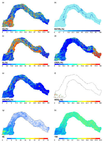 The spatial distribution of different landscape characteristics metrics levels along the Jialu River in greater Zhengzhou, China. (a) GSp (%); (b) WATERp (%); (c) ISp (%); (d) CROPp (%); (e) VACANTp (%); (f) MINEp (%); (g) RE; (h) TWI.