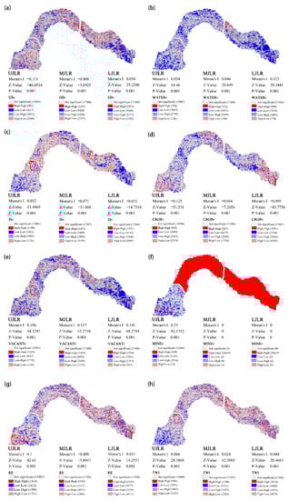 Cluster maps of local bivariate Moran’ I between landscape characteristics indexes of riverfront and flood inundation intensity. (a–h) UJLR, MJRL, LJLR.