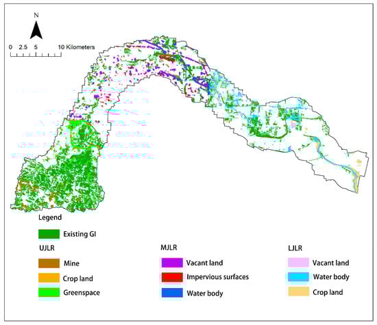 The areas with HH and LH designations were further segregated by using both global bivariate Moran I values (Table 4) and local bivariate Moran’s I (Figure 7). The top three landscape composition types were then identified for each region of the Jialu river system based on the relative values of the global bivariate Moran’s I correlation coefficients (Figure 8). In UJLR, MINEP, and CROPP, GSP had the highest global bivariate Moran’s I correlation coefficients. In MJLR, VACANTP, and ISP, WATERP had the highest global bivariate Moran’s I correlation coefficients. In LJLR, VACANTP, and WATERP, CROPP had the highest global bivariate Moran’s I correlation coefficients. These top three types or a total of nine were labelled as the “priority types” based these analyses and groupings.