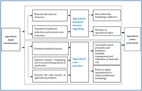 Agricultural digital transformation indirectly promotes ACP may through two action mechanisms, including agricultural industrial structure upgrading and agricultural scale operation. Figure 1. shows the conduction mechanisms of agricultural digital transformation affecting ACP.