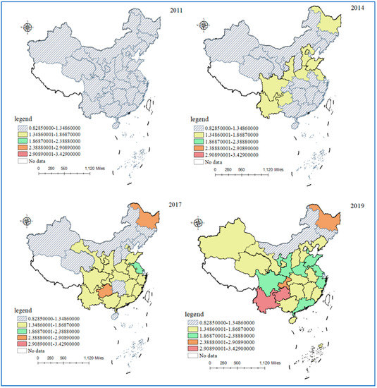 According to the calculation results of ACP in China, we use ArcGIS to draw a spatial-temporal evolution map of the ACP values from China’s 30 provincial administrative regions for the years 2011, 2014, 2017 and 2019, as displayed in Figure 2.