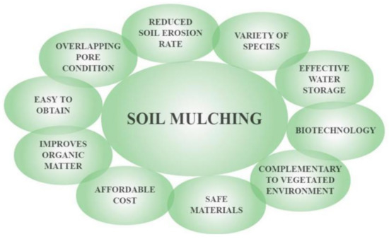 According to the nature of the mulch, it can be divided into two types, namely, nature-based and synthetic-based mulch. Nature-based mulch includes vegetative residues, biological geotextiles, gravel and crushed stones, and synthetic-based mulch includes plastic sheeting, super-absorbent polymers and biochar, according to the extracted database and global classification.