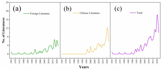 By organizing the 176 documents by year, it was found that the distribution of the literature can be divided into three stages. The first stage is from 1965 to 1993. In this stage, integrated research on the interception of soil mulching and karst soil leakage prevention was still in its infancy, and the first study appeared in 1965 [21]. There were only five relevant papers in this stage, all of which focus on soil mulching interception and soil erosion. The second stage is from 1993 to 2010, where the range of soil mulching types gradually expanded, and the filtering techniques were also summarized systematically. The number of studies studying the movement rules of soil moisture under karst mulching increased significantly. There was also a rapid and fluctuating growth in related research. The third stage is from 2010 to the present. After collation, it was found that related studies are more focused on the theoretical research of soil leakage while focusing on the mechanism research of soil mulching in the water infiltration process, with the highest annual number in 2020. Compared to the previous stages, the results of this research are showing an efficient growth trend.