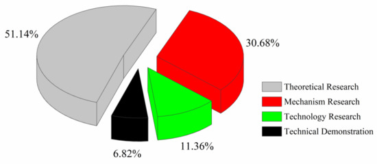 Of these, the proportion of theoretical research was the highest, with 51.14% of the total results from the literature. This was followed by 30.68% for mechanism research, 11.36% for technology research and 6.82% for technical demonstration. There is a lack of technical demonstration studies on soil leakage interception by soil mulching.