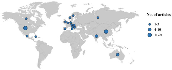 The global spatial distribution of the collected data. China and the United States are the main countries in this study, followed by India.