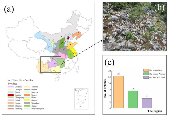 (a) The spatial distribution of this study in the provinces of China, where the red dots represent cities in the province (these cities are the main cities in the province), and the numbers near them indicate the number of documents from this province; (b) a karst landscape in southern China; (c) the number of studies in the three main regions of this research field in China.