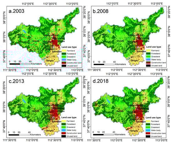 The construction land of Taiyuan is mainly concentrated in the east. From 2003 to 2018, it continued to expand to the periphery. However, due to the limitation of terrain, its expansion is mainly along the river valley to the south to occupy the area of farmland and water body (Figure 2). The northern and western regions are mountains and hilly, mainly grassland and woodland. In addition, the forestland area of Xinghualing District had a significant increase from 2003 to 2018, primarily as a result of the greening and forestry construction area of the East and West Mountains, and it belongs to the security control area of ecological environment in the overall land use planning of Taiyuan (2006–2020). The spatial pattern of land use in Taiyuan is consistent with its natural characteristics, such as topography, topography, and hydrology [].