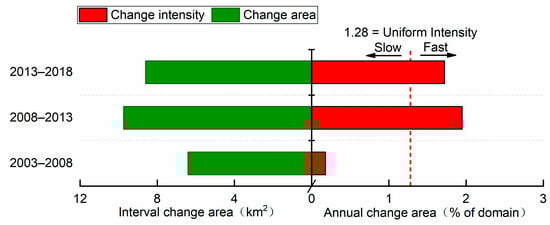 The rapid changes in land use were mainly focused on the two periods of 2008–2013 and 2013–2018, with the uniform annual changing areas accounting for 1.95% and 1.72% of the study area, respectively, which are greater than the average intensity of 1.28%, illustrating that Taiyuan is in a period of rapid development in two intervals (Figure 3). However, the average annual changing areas from 2003 to 2018 accounted for only 0.18% of the study area, which was a slowly increasing trend. The economic development and urban expansion of Taiyuan were dilatory and in the early stage of development.
