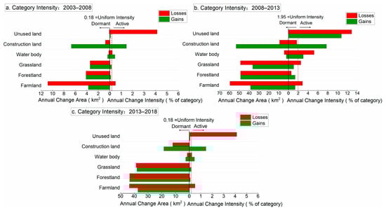 The category hierarchy further explains the interval level (Figure 4). From 2003 to 2008, except for unused land (small base of unused land area, large fluctuation in intensity), the loss and gain intensity of each type were slight (Figure 4a). Among them, the loss intensity of unused land and farmland exceeds the average intensity, and farmland is the type of land with the largest loss (right side of Figure 4a), while the gain intensity of construction land and water bodies exceeds the average intensity, but the change is relatively small.
