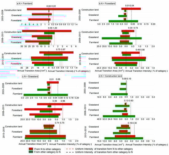 The intensity that farmland transformed into construction land in three periods was above the uniform intensity, and the stable transformation reached the largest, with a transition area of 28.47 km2 (Figure 5a) in 2008–2013. In 2003–2008 and 2008–2013, farmland and grassland were the main sources of the increase in forestland, while from 2013 to 2018, there was a small transfer from farmland, grassland, and construction land to forestland (Figure 5b), which resulted from the grain-for-green policy, the implementation of forestry ecological construction, and the further consolidation of future achievements. From 2003–2008, the increased area of grassland stemmed from land. In the same period, the intensity of grassland transfer to construction land overtook the average intensity. From 2013–2018, although there was an area conversion between land types, the area remained relatively stable (Figure 5c). In the whole period, construction land was mainly transferred from various land types, and farmland was the main source, but the average reduction intensity in each period gradually enhanced (from 0 to 0.13 to 0.16) (Figure 5d).