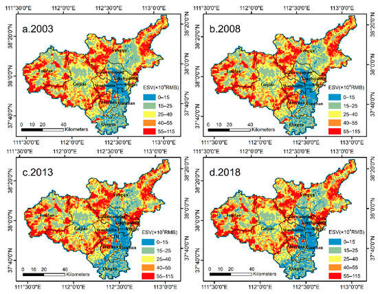 Spatial distribution of ESV of Taiyuan City from 2003 to 2018.