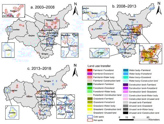 To discuss the response relationship between ESV and land use change in Taiyuan, we overlaid the results of the hotspot analysis of ESVs with layers of land use transfer from 2003 to 2018. The hot and cold spots of ESV in Taiyuan were mostly concentrated in the eastern main urban area and its surrounding areas and expanded to the south and north (Figure 7).