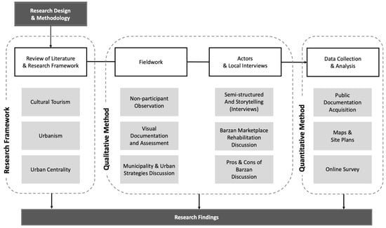It is widely accepted in urban studies to combine logical argument with observation, and research is not reduced to numbers due to the complexities of urban settings [68]. Using the literature on urban design and planning, this investigation analyzed the built environment of a particular marketplace in Barzan [69]. Several researchers [70] came to the same conclusion. Researchers focused on two variables for this study. The first step was to analyze the current market space design and determine how it can be enhanced through better rehabilitation planning and design. To ascertain if the market areas were accommodating to the public, observational and survey-based research was used to determine the study objectives. This study used a mixed-methods approach, which incorporated ethnographic techniques as well as visual and spatial techniques, all of which added to the depth of the data collected, validity, and reliability of the findings through the process of triangulations [71] (Figure 1).