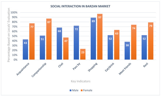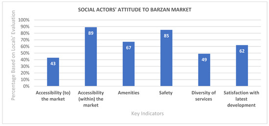 Using five key indicators, the second online survey was conducted to examine users’ attitude towards Barzan Market. The goal was to understand how users perceive and appreciate certain aspects of the place (Figure 13). The main issue was transportation and accessibility, where users argue that difficulty reaching the market (e.g., condensed urban area, limited parking, etc.) is one of the main factors that causes them to not frequently visit the place. On the contrary, the same users asserted that once they are within the marketplace, pathways and accessibility areas are clear and comfortable for pedestrians (An interview with two males and one female regarding transportation and accessibility to Barzan Market on 2 October 2022). However, as some of these pathways do not lead to significant spaces, users are discouraged from visiting certain areas within the marketplace.