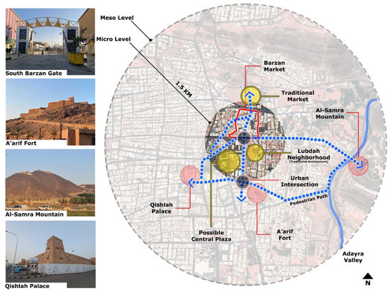 Micro and meso levels of the city center showing other significant historical landmarks. Source: Authors.