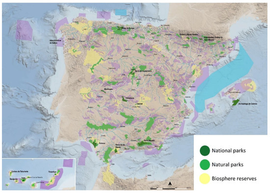 In addition, article 41 of Law 42/2007 includes the Natura 2000 Protected Network [73]. This network is defined as “a coherent ecological network made up of Sites of Community Importance (SCIs), Special Areas of Conservation (SACs) and Special Protection Areas (SPAs) for Birds, whose management will take into account economic, social and cultural demands, as well as regional and local particularities”. The SCIs, SACs, and SPAs for birds in Spain are considered PAs, with the designation Red Natura 2000 PA and with scope and limitations established by autonomous communities in their legislation and in the corresponding planning instruments. With respect to the Natura 2000 network, Spain contributes a greater area than other European countries, with approximately 220.000 km2, representing 27.4% of the country [73].