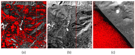Bad bands images. Alba Fucens: (a) VNIR cube, band 2; (b) SWIR cube, band 27; Sinuessa and (c) VNIR cube, band 61. The red dots and lines represent the pixels whose values are one line all at zero or Not A Number.