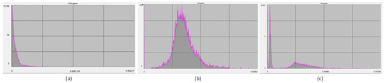Bad bands histograms. Alba Fucens: (a) VNIR cube, band 2; and (b) SWIR cube, band 27; Sinuessa: (c) VNIR cube, band 61.