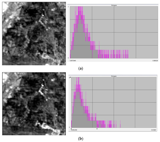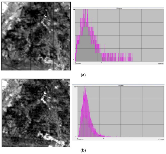 In band 2 of VNIR cube, classified as a bad band, the “salt and pepper” effect of the red points shows the lack of data in most of the image (Figure 5a); the relative histogram presents an irregular shape (Figure 6a).