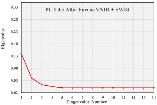 Alba Fucens’ results are reported in Figure 11, where the PCA highlighted how the transformed spectral information is concentrated in the first four PCs; moreover, the PCA shows how from the PC-5 (VNIR) the displayed information becomes difficult to be interpreted and after PC-10 it can be directly assimilated to noise.