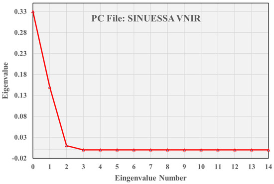 Sinuessa: PCA (eigenvalues) in the VNIR dataset; the PCA plot shows that the information is concentrated in the first three components; in particular the highest values are found in PC-1, PC-2.