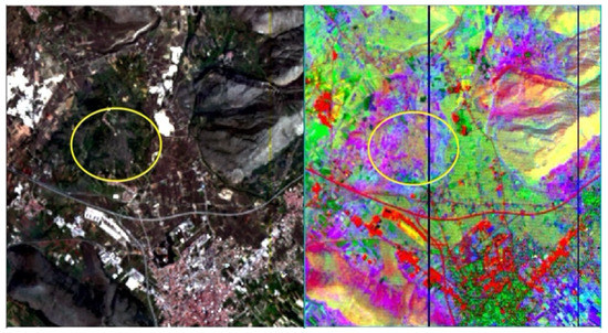 Alba Fucens’ PRISMA VNIR particular comparison referred to RGB (left) and PCA (right) image: in the highlighted central area it can be noted that the soil features are structurally different compared to the surrounding soils.
