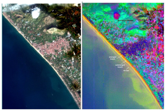 The turbidity is well featured in the spectral processing and it is linked to the presence of channel outlets into the sea and relevant sediment input from Garigliano River (north of Sinuessa). At the moment, the dataset is not able to provide information on the submerged structures of Sinuessa, due to the presence of this turbidity which alters the clarity of the water and the penetration of the signal into the water column. Other comparisons are not actually possible because subsequent images in PRISMA Data Hub are not available. The PCA analysis, however, gave information on the turbidity and on the submerged and emerged sedimentary features (Figure 13).