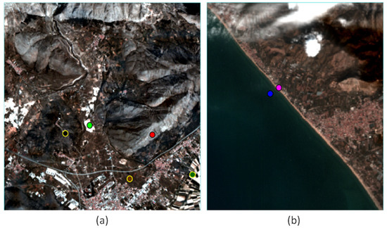 Regarding pre-processing, the L2C products were considered for both sites. The L2C images are radiometrically corrected but not orthorectified. An orthorectification on the hyperspectral images was performed with Envi 5.6.2 Software. Rational polynomial coefficients (RPCs) and a DEM (10 m of resolution) were used to correct the geometric distortions. In addition, some ground control points (GCPs) and check points (CPs), collected from a Sentinel 2 images, were used to improve the process.