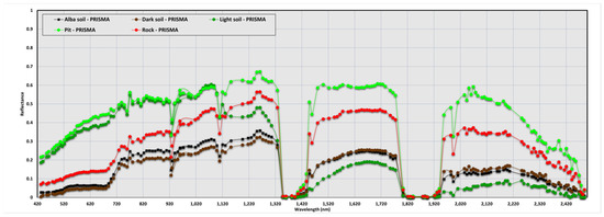 Another analysis to study PRISMA data was the extraction of spectral signatures from representative points and the comparison between Sentinel-2 and PRISMA was also performed. The chosen points include pit, rock and three different types of soil in Alba Fucens and sea and sand in Sinuessa. They were taken in extended areas, in order to ensure that the mean reflectance value of the chosen pixel was representative of the same feature.