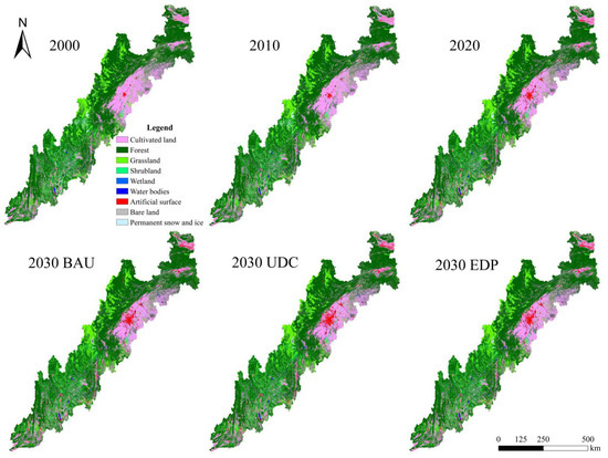 Land use and land cover in the Sichuan-Yunnan Ecological Barrier in 2000, 2010, and 2020 and three scenarios (BAU/UDC/EDP).