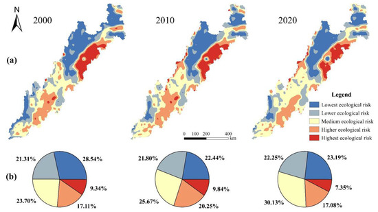 Spatial distribution (a) and proportion (b) of ecological risk in the Sichuan-Yunnan Ecological Barrier from 2000 to 2020.
