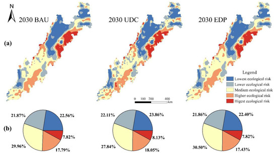 Spatial distribution (a) and proportion (b) of ecological risk under three different scenarios in 2030.