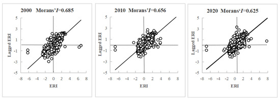 Global Moran’s I scatter figures of land use ERI in the Sichuan-Yunnan Ecological Barrier in 2000, 2010 and 2020.