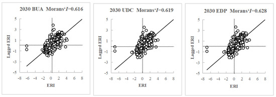 Global Moran’s I scatter figures of land use ERI in the Sichuan-Yunnan Ecological Barrier in three scenarios (BAU/UDC/EDP).