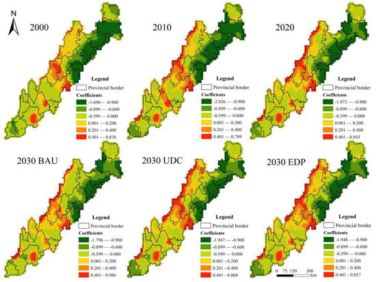 The MGWR model was used for analyzing the LER spatial response with the change in terrain gradient. Figure 8 shows that the response of LER to gradient changes in the Sichuan-Yunnan ecological barrier has apparent spatial variability and shows both positive and negative correlations in space. Regions with high positive correlations are concentrated in the high-gradient areas of Ganzi, Aba, and northeastern Liangshan. Regions with high negative correlations are concentrated in the low-gradient areas of Hanzhong, Dehong, and the Chengdu Plain. The degree of correlation between the two changed with time in the local areas. The positive correlation coefficient increased from 0 ~ 0.2 to 0.2 ~ 0.4 in the western region of Aba from 2000 to 2010. The positive correlation coefficient in northern Ganzi was enhanced by one interval. The correlation in northern Lijiang, at the junction with Liangshan and Diqing, changed from negative to positive and low to high. The correlation in northwestern Baoshan at the junction with Nujiang changed from negative to significantly positive. The regions with the highest positive and negative correlations from 2010 to 2020 both decreased. Regions with the highest reduction in positive correlations are concentrated in northeastern Lijiang and the junction with Diqing in Liangshan in the higher gradient terrain. The regions with the highest reduction in negative correlations are concentrated in Hanzhong and Chengdu Plain in the lower gradient terrain t. Compared with the three scenarios for 2030, the spatial patterns of ecological risk response to gradients were similar for the UDC and EDP scenarios. The differences were mostly in the central and northern parts of the research region. Under the EDP scenario, there is a small expansion in the negatively correlated area at the periphery. There is also a small contraction in the positively correlated area. There are significant spatial differences between the BAU and the other two scenarios, with a significant expansion of the negative correlation area under the BAU scenario in the Aba region. The positive correlation area shrinks, and the correlation weakens in the Ganzi region.