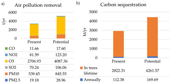 Tree benefits: (a) amount of air pollution absorbed expressed in carbon monoxide (CO), nitrogen dioxide (NO2), Ozone (O3), particulate matter (PM10 and PM2.5) and sulfuric dioxide (SO2); (b) carbon annually sequestrated and carbon stored in trees’ lifetime.