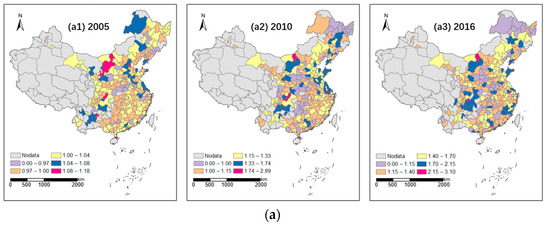 Based on Equation (1), the GTFP score of each Chinese city could be calculated; the scores were also geo-visualized in maps. For simplicity, the spatial distribution of GTFP scores in 2005, 2010, and 2016 are given in Figure 2a.