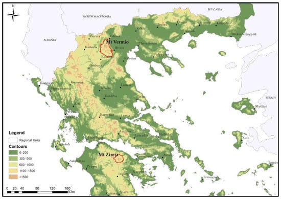 Mt Vermio is located in central-western Macedonia and administratively belongs to Imathia, Kozani, and Pella Regional Units. It has a north-south orientation with its tallest peak at 2052 m [25]. The climate is sub-Mediterranean in the uplands and meso-Mediterranean in the lowlands. The driest months are July and August, but due to the vicinity of archipelagos, the atmosphere is never completely dry [56]. The climate under the Köppen and Geiger [57] classification system ranges from Mediterranean-influenced warm-summer humid continental (Dsb) to warm-summer humid continental (Dfb). According to the classification approach of Mavromatis [58], Mt Vermio belongs to the bioclimatic zone wet with severe winter and to two different bioclimatic character categories: axeric temperate and sub-Mediterranean. Most of Mt Vermio is part of the network of the Natura 2000 protected areas [59]. Forests and shrublands are found mainly on the eastern part of the mountain.