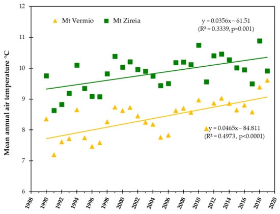 Mean annual air temperature between 1990 and 2019 for Mt Vermio and Mt Zireia.