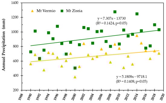 The annual precipitation between 1990 and 2019 was 666.8 mm for Mt Vermio and 917.3 mm for Mt Zireia (Table 2). Similar to temperature, annual precipitation for both Mt Zireia and Mt Vermio during the past 30 years showed considerable year-to-year variation (Figure 3).
