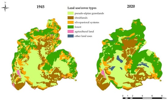 In 1945, most areas of Mt. Zireia were covered by pseudo-alpine grasslands (4712.3 ha), followed by forests (3130.5 ha), shrublands (2504.3 ha), and silvopastoral systems (2300.2 ha) (Table 6). In 2020 there was an increase (54.4%) in forests and shrublands (8.7%), while pseudo-alpine grasslands and silvopastoral systems decreased by −19.8% and −51.7%, respectively.