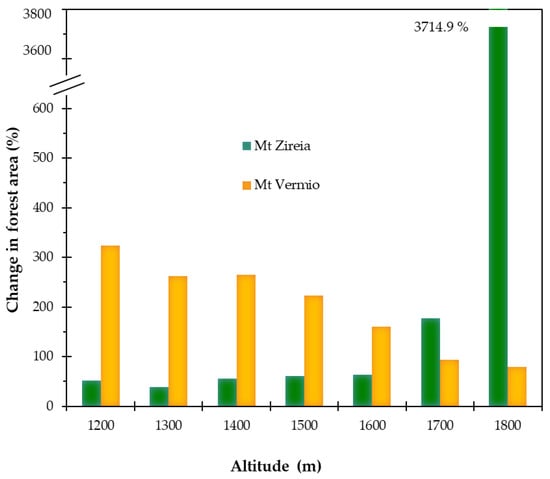 Change (%) in forest area per altitudinal zone between 1945 and 2020 for Mt Zireia and Mt Vermio.